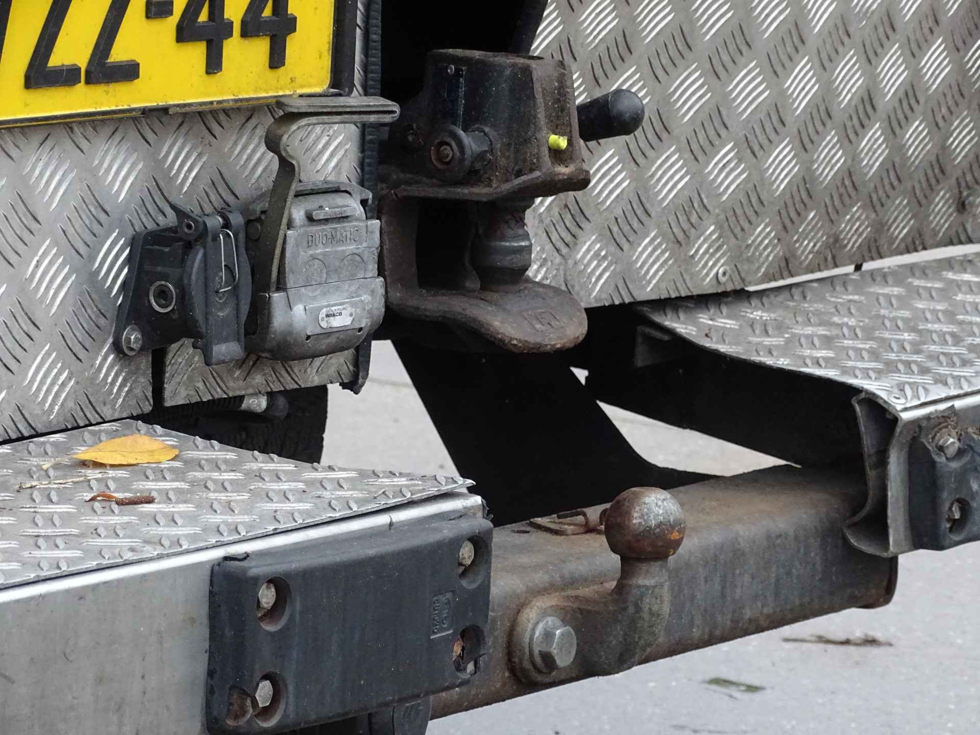 De wagen is uitgerust met een zware vrachtwagenkoppeling voor aanhangers met luchtremsysteem, inclusief bijbehorende aansluitingen, zoals zichtbaar op de foto. Hierdoor is hij geschikt voor professioneel en zwaarder trekwerk.
